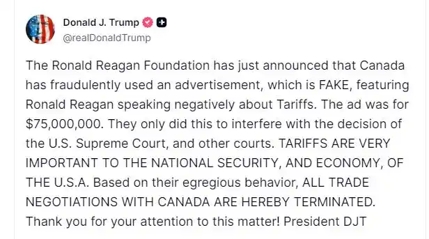 According to Trump, the decision follows a statement by the Ronald Reagan Presidential Foundation, which accused the Ontario provincial government of using a fraudulent political advertisement featuring edited clips of former President Ronald Reagan criticizing tariffs.